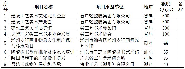为支持工艺美术行业发展,省经济和信息化委、财政厅联合组织了2017年广东省工业和信息化专项资金(工艺美术)项目申报、评审工作,现将2017年省工艺美术项目计划予以公示。公示期自2017年12月25日至12月31日,共7日。对公示内容如有异议,请在公示期内向省经济和信息化委消费品工业处(电话:020-83133466、83318522)和省财政厅工贸发展处(电话:020-83170213)反映。以个人名义反映情况的,请提供真实姓名、联系方式和反映事项证明材料等;以单位名义反映情况的,请提供真实单位名称(加盖公章)、联系人、联系方式和反映事项证明材料等。