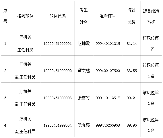 根据省委组织部、省人力资源社会保障厅和省公务员局《关于印发〈广东省2019年选调优秀大学毕业生工作方案〉的通知》(粤组通〔2018〕43号)和省委组织部、省人力资源社会保障厅《关于印发〈广东省2019年选调优秀大学毕业生资格审核、面试和体检等工作实施方案〉的通知》(粤组通〔2018〕54号)要求,经笔试、资格审核、面试等程序,现确定赵坤霞、谭文越、张雪竹、阮淼亮等4名考生为我厅2019年选调优秀大学毕业生体检对象,现将其综合成绩公布如下: