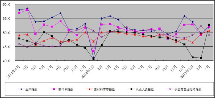 图2 2011年4月-2013年3月广东省重点企业PMI分项指数趋势图