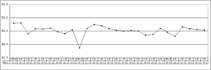 新订单指数(产品订货)为50.5,比上月回落0.3个百分点。