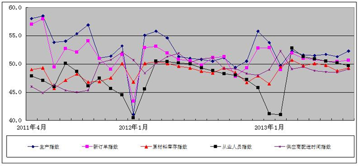 图2 2011年4月-2013年8月广东省重点企业PMI分项指数趋势图