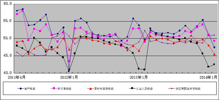 图2 2011年4月-2014年2月广东省重点企业PMI分项指数趋势图