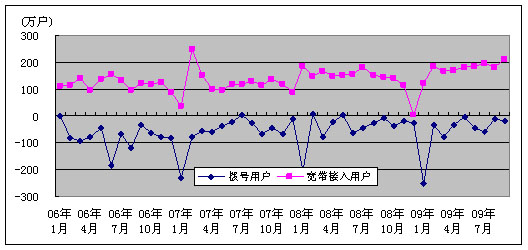 图2. 2006-2009年固定电话用户各月净增比较