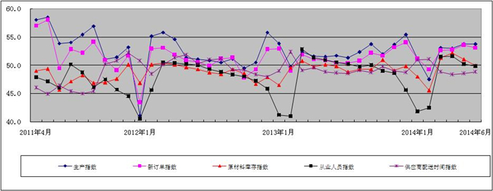 图2 2011年4月-2014年6月广东省重点企业PMI分项指数趋势图