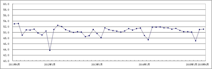 指数 名称 PMI 生产 指数 新订单 指数 原材料 库存指数 从业人员 指数 供应商 配送时间 指数 2015年4月 51.1 51.2 51.0 51.4 52.7 48.8 2015年3月 51.0 51.5 51.3 51.0 51.5 48.8 2015年2月 47.0 47.9 48.6 45.5 41.1 51.4 2015年1月 50.1 51.8 51.3 48.9 47.5 48.9 2014年12月 50.2 53.7 51.5 47.5 46.5 48.3 2014年11月 50.2 51.9 50.4 48.0 49.7 49.3 2014年10月 50.7 51.9 52.2 49.0 49.1 49.2 2014年9月 51.4 53.9 53.2 49.8 48.2 48.9 2014年8月 51.1 53.7 52.1 49.3 48.9 48.7 2014年7月 51.6 53.3 52.7 49.6 50.6 48.8 2014年6月 51.6 53.7 53.1 49.9 50.0 48.8 2014年5月 51.9 53.7 53.5 51.0 50.2 48.5 2014年4月 51.8 53.0 52.7 52.1 51.6 48.3