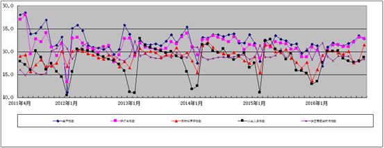 图2 2011年4月-2016年10月广东省重点企业PMI分项指数趋势图