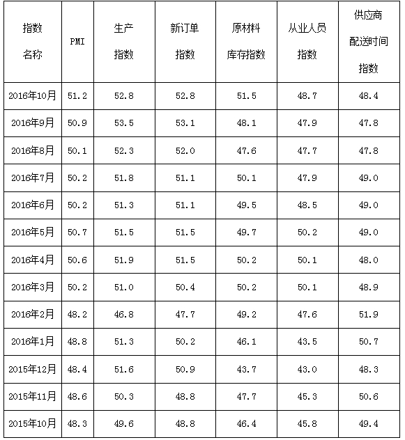 表 2015年10月-2016年10月广东省重点企业PMI主要分项指数值表