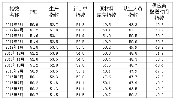 表 2016年5月-2017年5月广东省重点企业PMI主要分项指数值表