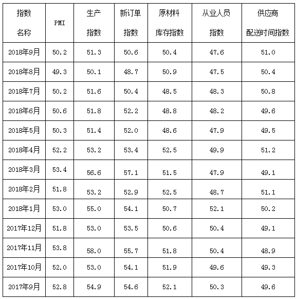 表 2017年9月-2018年9月广东省制造业PMI主要分项指数值表