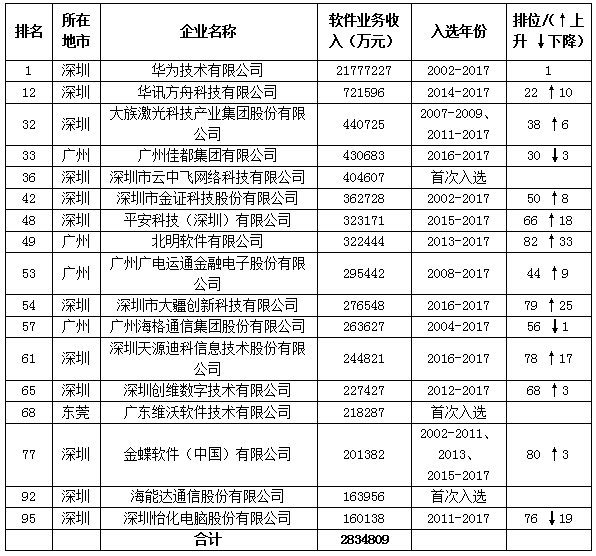 2017年(第十六届)中国软件业务收入前百家企业广东入选名单