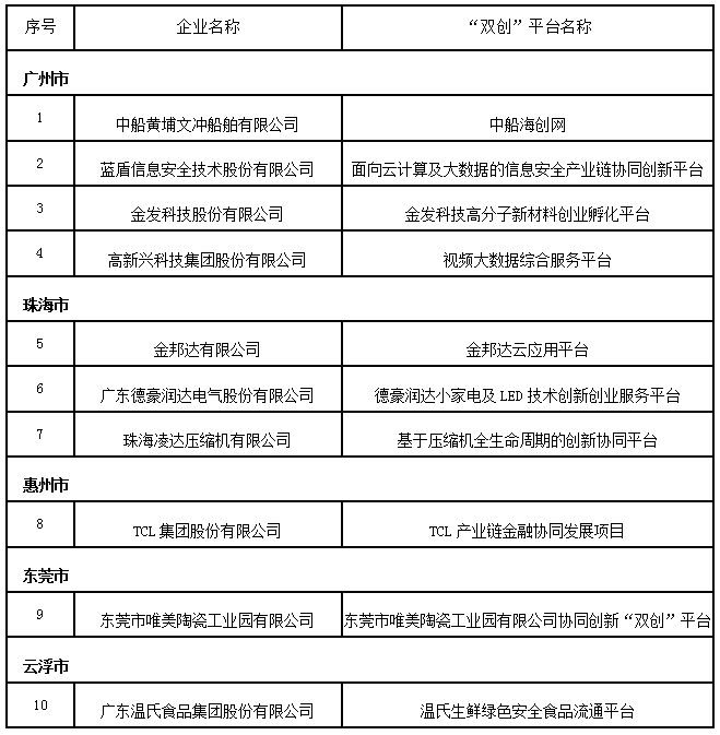 按照《广东省经济和信息化委关于开展全省大企业“双创”示范工作申报的通知》(粤经信信息函〔2017〕49号)要求,我委组织了2017年广东省大企业“双创”示范的评审工作。经各地经济和信息化主管部门推荐和专家评审,评选出10个广东省“双创”示范大企业,现予以公示。