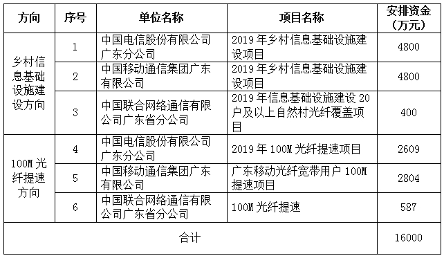 为贯彻落实《广东省信息基础设施建设三年行动计划(2018-2020年)》(粤府办〔2018〕14号),推进百兆光纤进家庭、千兆光纤进小区,以粤东粤西粤北地区为重点推进20户以上自然村连通光缆,我厅于2018年10月16日印发了《香港六合彩预测专家 关于开展2019年信息基础设施建设资金申报工作的通知》(粤工信信息函〔2018〕9号),并于2018年11月6日组织专家对申报项目进行评审。根据评审结果拟安排1.6亿元专项资金用于支持2个方向共计6个项目。现将资金安排计划予以公示(见附件)。公示期自2018年12月28日至2019年1月3日,共7天。对公示内容如有异议,请在公示期内向香港六合彩预测专家 (信息化推进处)和省财政厅(工贸发展处)反映。以个人名义反映情况的,请提供真实姓名、联系方式和反映事项证明材料等;以单位名义反映情况的,请提供真实单位名称(加盖公章)、联系人、联系方式和反映事项证明材料等。