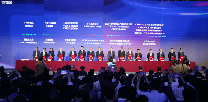 会上还举行了省经济和信息化委、国家开发银行广东分行开发性金融推动超高清视频产业转型升级合作备忘录,粤港澳大湾区4K产业基地,广州开发区创维超高清(4K)产业基地等7个项目的签约仪式,并为省市共建超高清视频(4K)产业基地(广州、惠州)、广东省第二批4K电视网络应用试点示范城市(珠海、汕头、中山)等举行了授牌仪式。