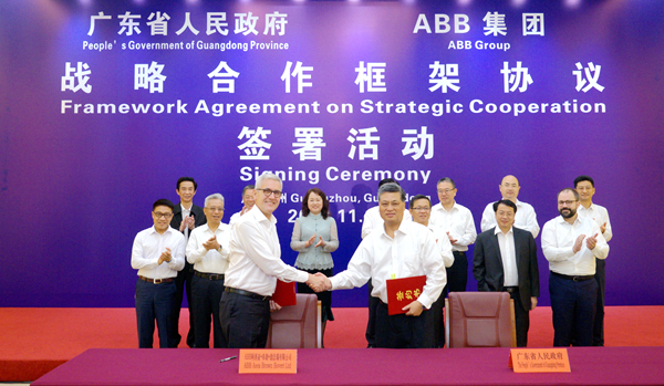 11月13日上午,广东省政府与ABB集团在广州签署战略合作框架协议。省长马兴瑞、ABB集团总裁兼首席执行官史毕福代表双方签约。
