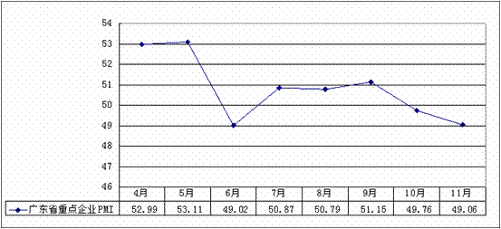 2011年11月,广东省制造业采购经理指数(重点企业PMI)为49.06,比上月回落0.70个百分点,连续2个月回落在50%荣枯线之下,这主要由新订单指数、从业人员指数拉低所致。