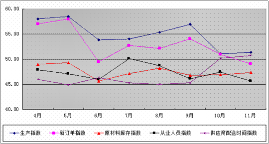 图2 2011年4-11月广东省重点企业PMI分项指数趋势图