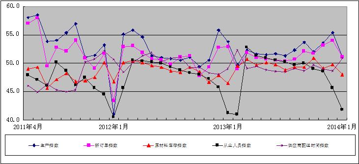 图2 2011年4月-2014年1月广东省重点企业PMI分项指数趋势图