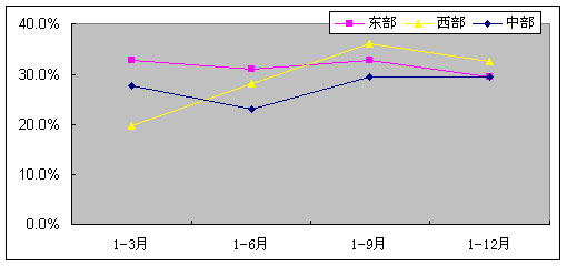 东部地区累计完成软件业务收入6389.2亿元,占全国软件业务收入的84.4%,同比增长29.5%,增速比1-11月回落0.8个百分点。北京、广东、江苏规模位居全国前三甲,其中江苏省一直保持快速增长势头,增速超过30%。西部地区累计完成软件业务收入659.7亿元,同比增长32.6%,高于1-11月3.5个百分点,但比1-9月低了3.5个百分点,其中四川、贵州增速均超过50%,但重庆、陕西低于全国平均水平,特别是陕西增速仅为8.3%。中部地区累计完成软件业务收入524亿元,同比增长29.4%,低于1-11月增速2.1个百分点。