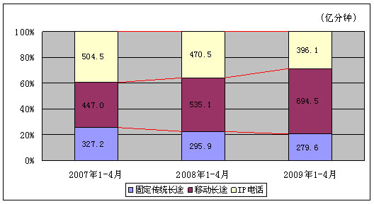 2009年1-4月,长途电话通话总时长达到1370.3亿分钟,比上年同期增长5.3%。其中固定传统长途、IP电话通话时长分别下降5.5%、15.8%,而移动长途电话通话时长增长29.8%。