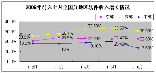 1-6月,东部地区累计完成软件业务收入3685.4亿元,占全国的86.3%,同比增长22.6%,增速比去年同期下降8.4个百分点,比1-5月上升0.2个百分点;西部地区累计完成软件业务收入359.3亿元,同比增长30.9%,增速比去年同期高出2.8个百分点;中部地区累计完成软件业务收入225.4亿元,同比增长13.6%,增速比去年同期下降9.4个百分点,比1-5月下降6.8个百分点。