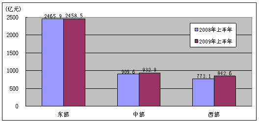 图8. 2008-2009年同期东、中、西部电信主营业务收入