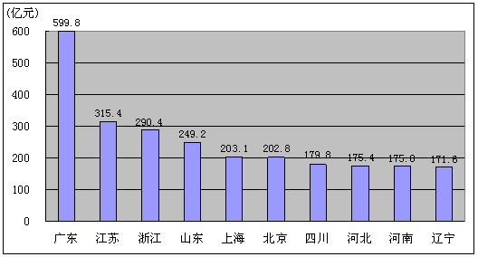 图12. 2009年上半年电信主营业务收入排名前十名的省份