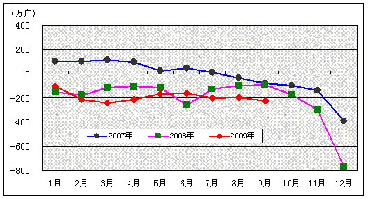 图2. 2006-2009年固定电话用户各月净增比较