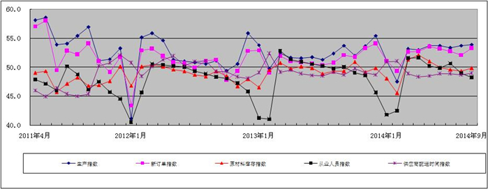 图2 2011年4月-2014年9月广东省重点企业PMI分项指数趋势图