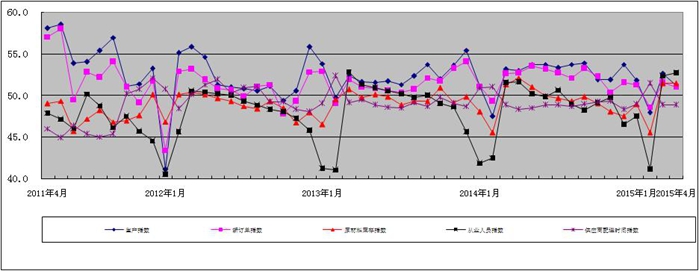 图2 2011年4月-2015年4月广东省重点企业PMI分项指数趋势图