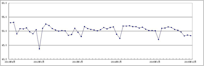 图1 2011年4月-2015年12月广东省重点企业PMI趋势图
