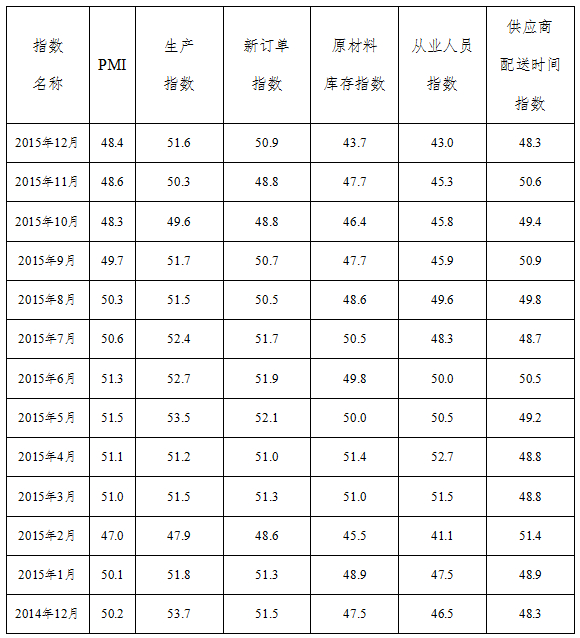 表1 2014年12月-2015年12月广东省重点企业PMI主要分项指数值表