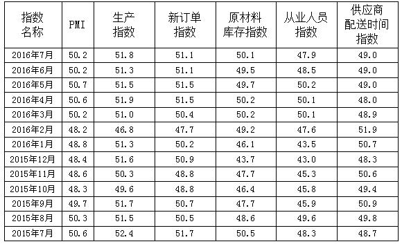 表1 2015年7月-2016年7月广东省重点企业PMI主要分项指数值表