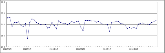图1 2011年4月-2016年11月广东省重点企业PMI趋势图