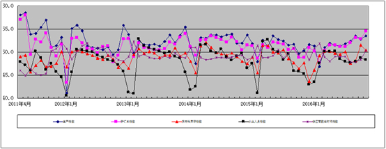 图2 2011年4月-2016年11月广东省重点企业PMI分项指数趋势图