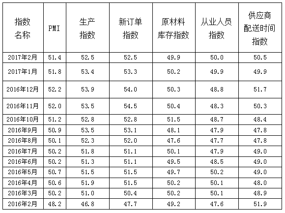 表 2016年2月-2017年2月广东省重点企业PMI主要分项指数值表