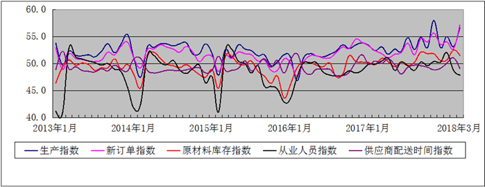 图2 2013年1月—2018年3月广东省制造业PMI分项指数趋势图