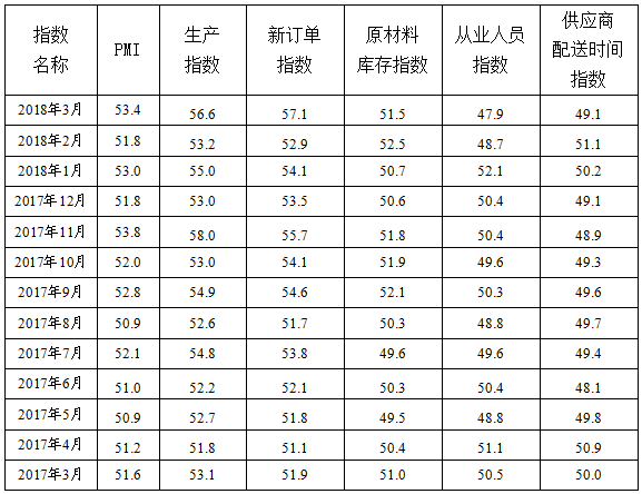 表 2017年3月-2018年3月广东省制造业PMI主要分项指数值表
